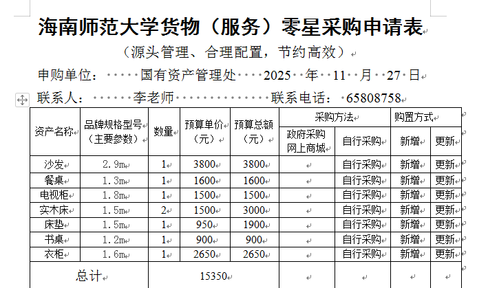 现因工作需要,申请采购家具如下,现已公示,如有异议,请联系李老师,65808785。